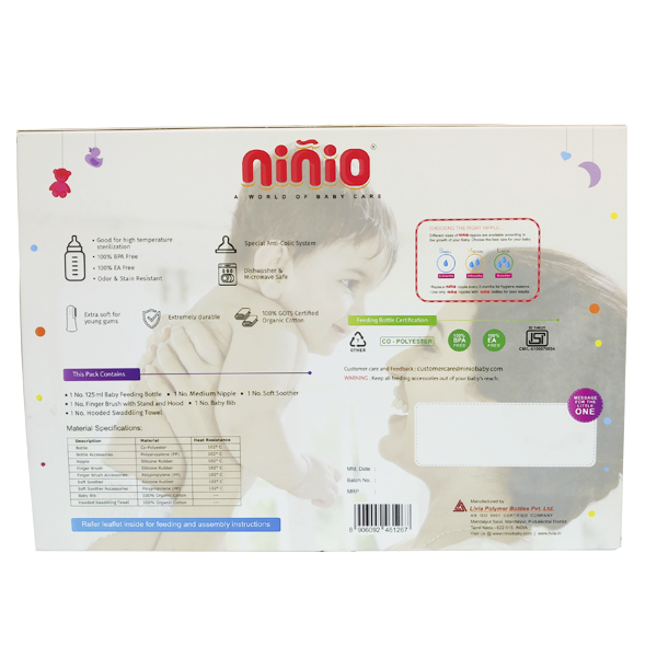 niñio Baby Feeding Bottle is one of the safest choices you can make for your baby. Made from TRITAN Co-polyester Material from Eastman USA, bottles are Unbreakable and Sturdy. Bottles come equipped with anti-colic Teats that prevent bubbles while feeding. The wide shape of the bottle and the teat mimic breastfeeding, making the breast to bottle transition smooth and painless.